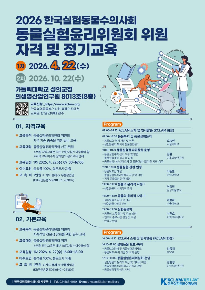 - 신청: 한국실험동물수의사회 홈페이지(https://www.kclam.org/), 교육일 한 달 전부터 접수